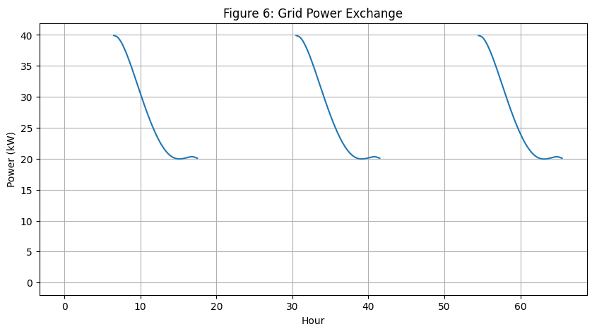Figure 7 shows the dynamic interaction between the PV-battery system and the electrical grid. When PV generation exceeds the load and battery capacity, surplus power is exported to the grid. When PV output is insufficient and the battery cannot fully meet demand, power is imported from the grid. The figure illustrates both positive and negative power flow scenarios, capturing the net energy exchange. Daily patterns follow PV generation trends, with peak exports occurring during midday and imports during early morning or evening. Grid interaction analysis is critical for planning hybrid energy systems and ensuring stable supply. It helps optimize energy management strategies, reduce grid dependency, and evaluate economic benefits. Variations between days indicate the impact of daily irradiance and load fluctuations. This figure provides a practical perspective on integrating renewable generation with conventional infrastructure. It also supports performance metrics such as capacity factor and system efficiency evaluation. By visualizing grid flows, system designers can assess operational feasibility and resilience.