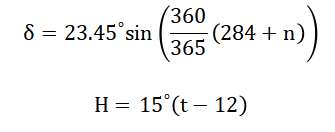 The mathematical equations used in this study describe the physical behavior of solar radiation, photovoltaic conversion, and energy storage dynamics in a structured manner. The solar declination equation determines the angular position of the sun relative to the equator and varies throughout the year based on the day number. The hour angle represents the apparent movement of the sun across the sky and is calculated from local solar time. Using these two parameters along with geographic latitude, the solar zenith angle is computed to determine the sun’s position in the sky at any given moment. The irradiance model estimates the amount of solar radiation reaching the Earth’s surface by considering atmospheric attenuation through the air mass concept. The plane-of-array irradiance equation then adjusts horizontal radiation to match the tilt orientation of the solar panel. The photovoltaic power equation multiplies incident radiation by panel area and temperature-corrected efficiency to estimate electrical output. Temperature correction accounts for efficiency reduction at higher cell temperatures. The battery energy balance equation updates the state of charge based on surplus or deficit power over time. Together, these equations form an integrated mathematical framework that accurately represents solar energy generation, conversion, and storage behavior.