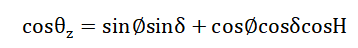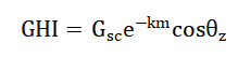 Clear-sky global horizontal irradiance is estimated as where (G_{sc}) is the solar constant, (m) is air mass, and (k) is the attenuation coefficient [32].