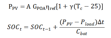 Finally, PV output power is modeled as and battery state-of-charge evolves according to ensuring dynamic energy balance within the system [34].