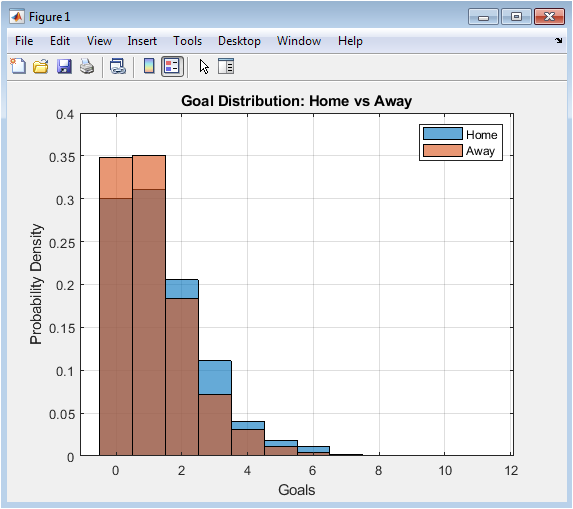This figure illustrates the distribution of goals scored in the league by home and away teams. Home teams tend to have slightly higher goal frequencies due to home-field advantage, which is evident in the histogram. Each bar represents the probability density of scoring a specific number of goals. Overlaying the home and away distributions allows comparison of scoring trends. Peaks indicate the most common number of goals per match. This visualization helps identify scoring patterns and the variability between teams. It also provides insight into offensive versus defensive tendencies in the league. Analyzing this figure informs model calibration for goal prediction. It confirms that the synthetic data reasonably reflects realistic scoring behavior. Overall, it serves as a baseline descriptive statistic for further analysis.