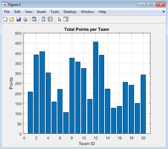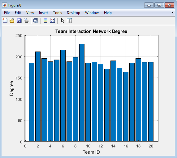 Network analysis represents interactions between teams through a weighted adjacency matrix, allowing computation of centrality and connectivity metrics. Visualization techniques, including histograms, bar plots, scatter plots, and error bars, are used to interpret patterns and trends. The methodology ensures integration of team-level, player-level, temporal, and network data. Statistical and machine learning models are validated through simulation, cross-comparison, and reproducibility checks. Emphasis is placed on interpretability and scalability to real-world leagues. The framework is implemented entirely in MATLAB, leveraging its statistical and computational toolboxes. This approach enables multi-scale, probabilistic, and data-driven evaluation of sports performance [24]. Overall, the methodology combines robust statistical modeling, machine learning, and network analysis to provide actionable insights for teams, players, and analysts.