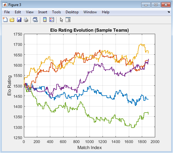 This figure shows the dynamic evolution of team strengths using the Elo rating system. Each line represents a sample team, and the y-axis indicates its rating. Ratings increase or decrease depending on match outcomes relative to expectations. Upward trends indicate consistent performance above expectation, while downward trends reflect poor performance. Elo ratings incorporate match results iteratively, providing a real-time measure of strength. Comparing multiple teams highlights relative changes in competitive position. Sharp fluctuations indicate unpredictable match outcomes or upset victories. This visualization captures both short-term and long-term performance dynamics. It also validates the Elo model implementation in the simulation. Overall, it demonstrates the temporal adaptability of Elo ratings in tracking team performance