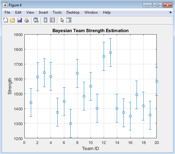 This figure presents the estimated latent strength of each team using Bayesian inference. Each point corresponds to a team’s mean posterior strength, while error bars indicate uncertainty (standard deviation). Larger error bars indicate less confidence in the estimate due to limited information or high variability. Bayesian updating combines prior assumptions with observed Elo ratings to produce these estimates. The figure allows comparison between teams’ true performance and predicted strength. Teams with higher posteriors are expected to perform better in future matches. Visualization of uncertainty is crucial for risk assessment in strategy planning. It also highlights the advantage of probabilistic modeling over deterministic metrics. This figure integrates data from multiple sources to provide a comprehensive assessment of team ability.
