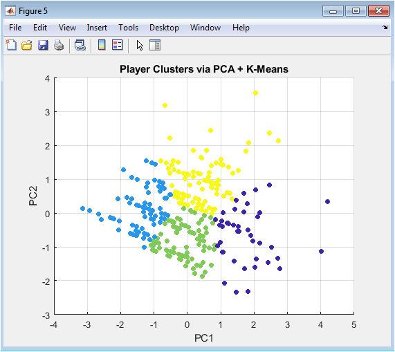 This scatter plot visualizes players after dimensionality reduction using PCA. The first two principal components represent the most significant variance in player statistics. Points are colored according to k-means cluster assignments, revealing distinct player types. Clusters may correspond to high-performing stars, average performers, or specialized roles. The figure allows identification of performance patterns and outliers. PCA ensures visualization is interpretable while retaining key information. It also aids in comparing player distributions across teams or seasons. Clustering helps in talent identification and strategic planning. Players in the same cluster share similar statistical profiles. Overall, this figure summarizes multi-dimensional player data in an intuitive format.