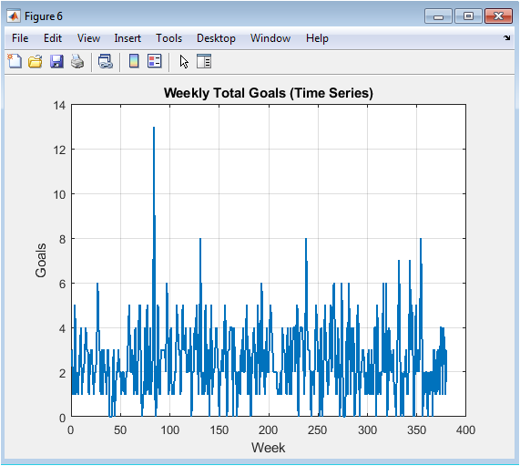 Temporal analysis captures trends, cycles, and anomalies in sports performance over weeks and seasons. Weekly goal totals are tracked to study scoring patterns and league evolution.