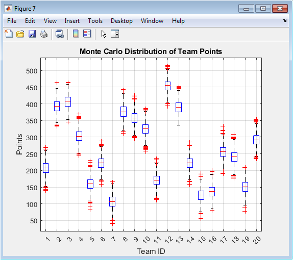 This boxplot represents the spread of team points generated from Monte Carlo simulations. Each box shows the interquartile range of points for a team, highlighting variability and uncertainty. Whiskers indicate the full range of possible outcomes, capturing rare but plausible scenarios. Median values reflect the expected points, while outliers show extreme fluctuations. This analysis quantifies the impact of stochasticity in match outcomes. Teams with narrow boxes demonstrate stable performance, while wider boxes indicate higher uncertainty. The visualization supports risk assessment and predictive analysis. Monte Carlo simulation provides a probabilistic understanding of league rankings. It complements deterministic metrics such as total points. Overall, it emphasizes the importance of uncertainty in sports analytics.
