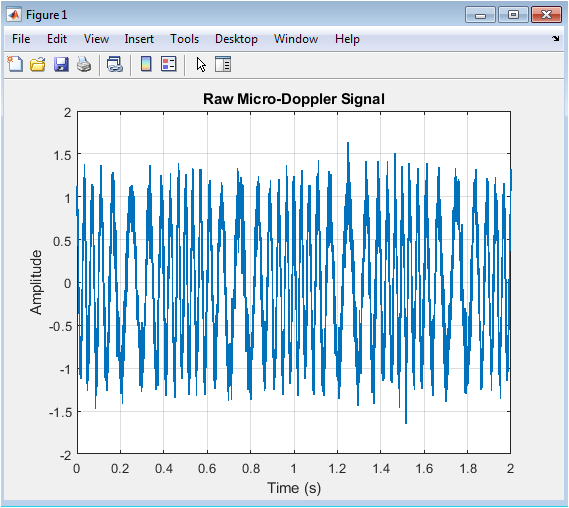 This figure shows a plot of a raw micro-Doppler signal, which is a time-series signal representing the radar echo from a target. The signal is a combination of a cosine wave and a sinusoidal frequency modulation, simulating the micro-Doppler effect caused by the target’s motion. The x-axis represents time, and the y-axis represents the amplitude of the signal. The signal is noisy, with a signal-to-noise ratio (SNR) of approximately 5 dB. The plot shows the signal’s amplitude varying over time, indicating the presence of micro-Doppler components. The raw signal is difficult to interpret directly, highlighting the need for feature extraction techniques. The signal is sampled at a frequency of 2000 Hz, and the duration is 2 seconds. The plot is a representative example of the signals used in the classification experiment.