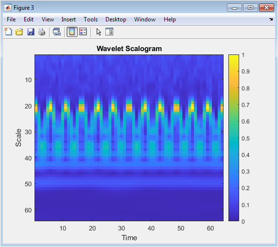This figure shows the Wavelet scalogram of the raw micro-Doppler signal. The Wavelet transform is a time-scale representation of the signal, showing the signal’s frequency content at different scales. The x-axis represents time, and the y-axis represents scale. The colorbar indicates the magnitude of the Wavelet coefficients, with warmer colors indicating higher magnitudes. The scalogram shows the presence of micro-Doppler components, including a fundamental frequency and harmonics. The Wavelet transform is computed using the Morlet wavelet, with a scale range of 1-64. The scalogram provides a time-scale representation of the signal, highlighting the multi-resolution nature of the micro-Doppler components.