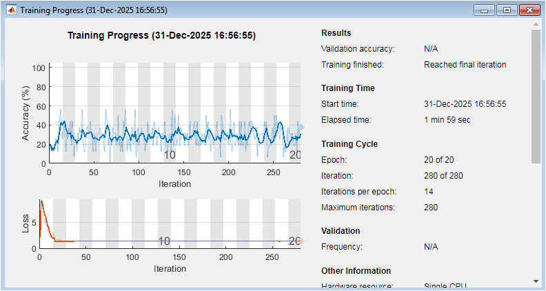 This figure shows the training progress of the CNN, including the training accuracy and loss over epochs. The x-axis represents the epoch number, and the y-axis represents the accuracy or loss. The plot shows the training accuracy increasing and the training loss decreasing over epochs, indicating that the CNN is learning to classify the micro-Doppler signals. The training process is stopped after 20 epochs, with a final training accuracy of approximately 98%. The plot provides insight into the CNN’s learning process and convergence.