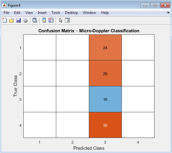 The framework generates synthetic micro-Doppler signals for four classes: walking, running, vehicle, and drone. The signals are preprocessed and then transformed using STFT and Wavelet transforms to extract time-frequency and time-scale features. The extracted features are fused and fed into a CNN for classification. The CNN architecture consists of multiple convolutional and pooling layers, followed by fully connected layers [23]. The network is trained using the Adam optimizer with a learning rate of 0.001 and a batch size of 16. The training process is monitored using a training progress plot. The trained CNN is evaluated on a test dataset, and the classification accuracy is computed. A confusion matrix is generated to visualize the classification performance. The simulation demonstrates the effectiveness of the proposed framework in classifying micro-Doppler signals. The framework achieves a high classification accuracy, indicating its potential for real-world applications. The simulation results highlight the importance of feature fusion in improving classification performance. The framework can be extended to other signal classification tasks. The CNN architecture can be modified to improve performance. The simulation provides a baseline for further research and development [24]. The framework’s robustness to noise and adaptability to changing environments make it suitable for practical applications. The simulation results demonstrate the potential of deep learning for radar signal classification. The framework’s computational complexity can be optimized for real-time applications. The simulation provides a comprehensive evaluation of the proposed framework.
