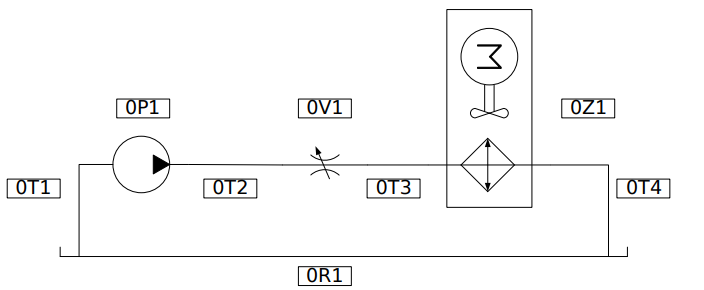 For this system, the standard approach is to admit that the pump (0P1) operates on steady flow, since its internal volume is small in comparison to the other components in the system, and since its transient period is significantly smaller than that of the heat exchanger (SIDDERS et al., 1996). On such case, it is convenient to admit that the pump is a flow source connected to a control volume that represents the pipes/conduit (0T2). The same approach can be taken for the valve (0V1), though the model now used is that of a flow restriction followed by a control volume. For the heat exchanger the interpretation is different, making use of a restriction that reproduces the loss of hydraulic energy given a volumetric flow between its inlet and outlet, in addition to a control volume that represents it, and thus the restriction control volume is the same component. (CARVALHO, 2023). Figure 11 illustrates a closed-loop hydraulic circuit designed for the actuation of a double-acting cylinder. Fluid is drawn from the reservoir (0R1) through the suction line (0T1) into the hydraulic pump (0P1), which pressurizes the flow. The pressurized fluid passes through a line filter (0T2) to remove contaminants before entering a check valve (0V1) that ensures unidirectional flow toward the actuator. A second filter or coupling element (0T3) further conditions the fluid before it reaches the double-acting hydraulic cylinder (0Z1), where hydraulic energy is converted into linear motion. The return flow from the actuator travels through the return line (0T4), passing another filtering stage, and is discharged back into the reservoir (0R1), completing the cycle. This configuration ensures continuous operation with controlled flow direction and efficient conversion of hydraulic power into mechanical work.