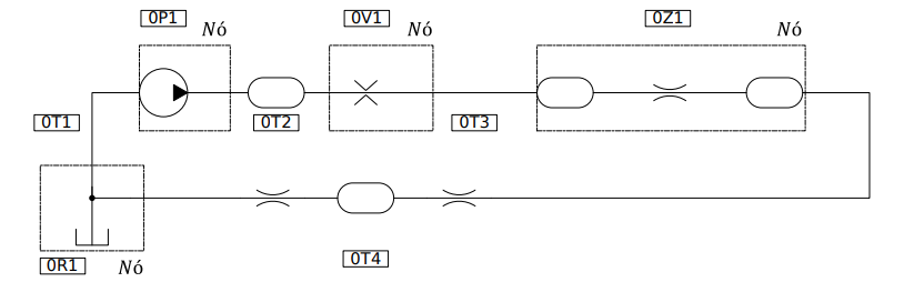 Considering as an example the following hydraulic system, represented in Figure 10, containing: Pump (0P1), valve (0V1), heat exchanger (0Z1) and reservoir (0R1). The pump receives mechanical energy in the form of work () and converts part of this energy into enthalpy ( in the fluid that goes through the component. The valve does not perform work, but dissipates part of the hydraulic energy received from the pump and produces entropy. The heat exchanger dissipates hydraulic energy while also exchanging heat ( into the system surroundings.
