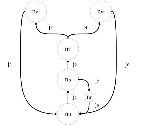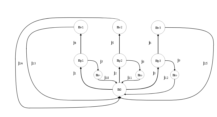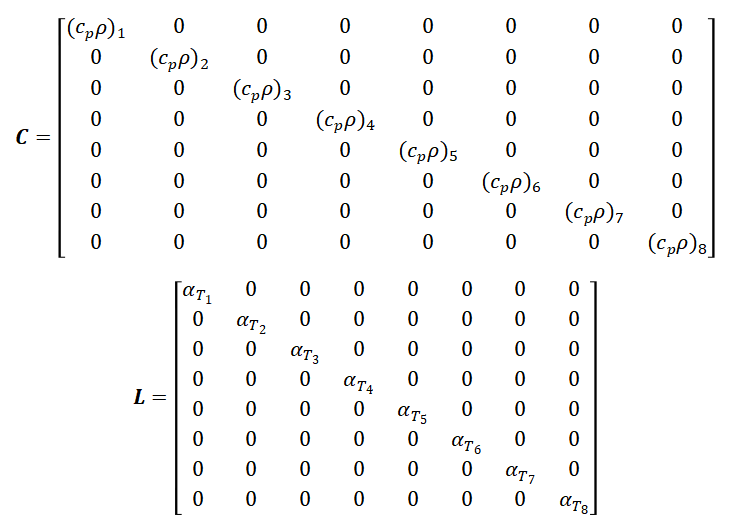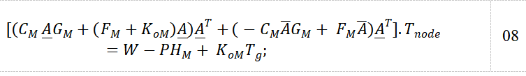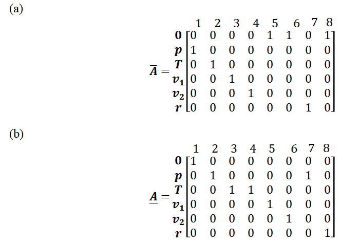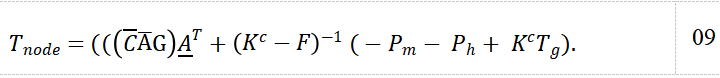 In Equation 02 above, is the mass flow rate, the specific heat capacity, the heat transfer coefficient and thermal power. The relationship between nodes and branches are established using positive and negative incidence matrices ( and can be used to form the nodal normalization matrix, (CARVALHO, 2023):