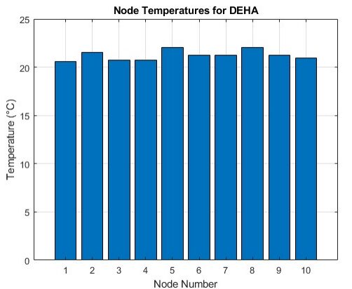 Plotting the temperatures in MATLAB, a near uniform temperature distribution can be seen across the system, as indicated in Figure 23. In the DEHA, it was observed that all temperatures stayed near the ambient temperature of 20 due to the higher efficiency of the solution. Having more components and significantly smaller pressure drops means there is less energy wasted by throttling and by internal leakage, as leakage depends on pressure and flow.