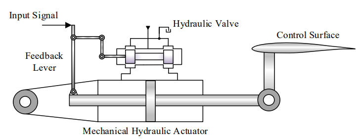 It consists of a mechanically signaled, hydraulically powered actuator equipped with an integrated feedback mechanism and supplied by a centralized hydraulic power unit (HPU). The control input, typically derived from a pilot-operated lever or mechanical linkage, displaces a directional control spool valve connected to the high-pressure hydraulic circuit. This displacement directs pressurized fluid into one side of a double-acting actuator while simultaneously venting the opposite chamber to the return line, producing linear motion that is transmitted to a control surface. A mechanical feedback linkage, coupled to the actuator rod, progressively re-centers the valve spool as the commanded displacement is achieved, thereby interrupting fluid flow and maintaining the control surface in its target position. This closed-loop arrangement minimizes pilot workload, ensures positional accuracy, and provides inherent stability by automatically compensating for external disturbances without requiring continuous manual correction. (NOSTRANI, 2021).