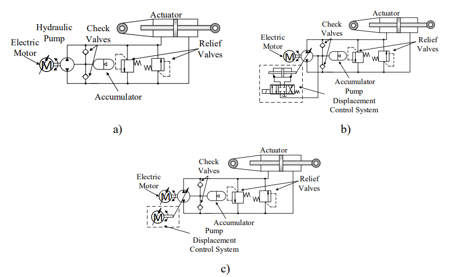 - Figure 5 – Electro-Hydrostatic Actuators Configurations. a) FPVM; b) VPFM; c) VPVM.