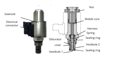 Both concepts rely on on/off valves to ensure proper performance. For these applications, seat valves are the most used. This variant of valve is characterized by its ease of manufacture, strong resistance to heat and contaminants and minimal internal leakage, making for a highly reliable component, with a rate of failure in the order of (BELAN, 2018; LINJAMA, 2011; MANTOVANI, 2019; PETTERSSON, 2018). Its main components are in Figure 6.