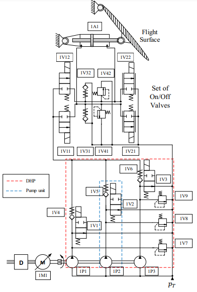 Another solution, proposed by Silva (2023) is a configuration of hydraulic actuator that combines the benefit of the MEA concept with Digital Hydraulics, composed of a decentralized actuation system with an electric motor with speed control and a digital hydraulic pump (DHP) to move a symmetric actuator. It also replaces the use of servo valves with on/off valves, reducing the weight of the system and making it more flexible to new arrangements, as can be seen in Figure 8.