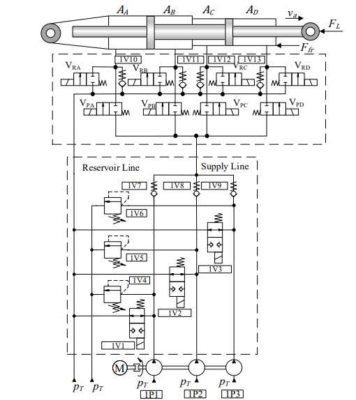 The use of a variable speed digital pump applies the power-on-demand concept, aiming to control the hydraulic energy supplied to the system, and the DHP increases the number of different flow rates provided at each rotational frequency, optimizing the use of the pump through more efficient combinations (SILVA et al., 2021). The VSDEHA can also be applied to a multichambered cylinder.
