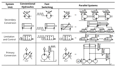 As shown in Table 1, digital hydraulics can be applied in all units of a hydraulic system, being its solutions based on two modes of operation: parallel associated elements or fast switching (LINJAMA, 2011). The behavior of parallel systems can be determined by the contribution of hydraulical components, including valves, with their size and quantity resulting on a given flow control, as well as pumps, actuators and hydraulic motors. Fast switching makes use of one or more valves, controlled with the technique of Pulse-Width Modulation – PWM, with the control flow depending on the width and frequency of the switching pulses.