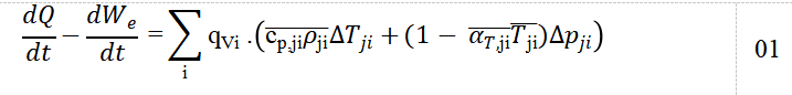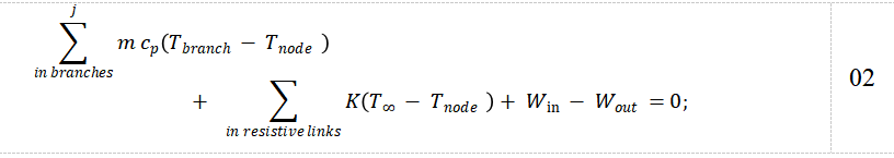 In which is the difference in temperature, the difference in pressure, from the outlet in relation to the inlet at the control volume, is the volumetric flow through a control volume, (1/K) is the modular average coefficient of isobaric volumetric expansion, is the average temperature, is the heat transfer rate through the control surface and is power exchanged from the system and its surroundings, with the heat flux being positive when the system receives heat, and power is positive when work is done by the control volume. For a network of branches (pipes, heat exchangers, valves) connected at nodes (reservoirs, junctions), the code is based on steady-state nodal thermal–hydraulic balancing, where the energy balance at every node is adapted from the First Law of Thermodynamics (CARVALHO, 2023). Thus Equation 01 can be adapted into: