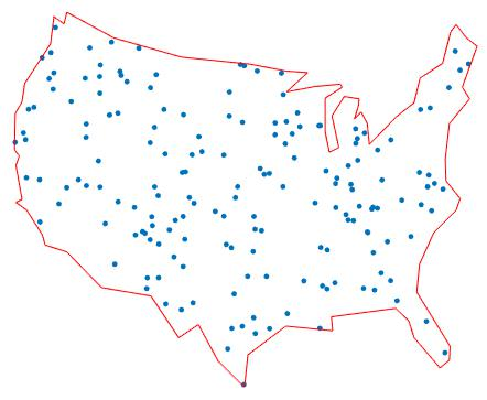 - Generating random city locations: The code generates a set of random city locations within the US border.