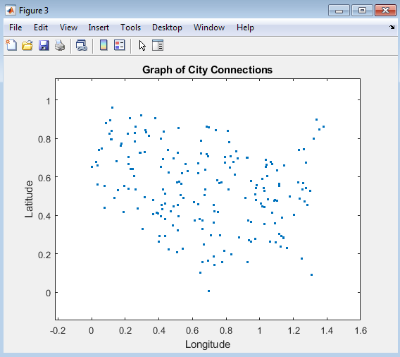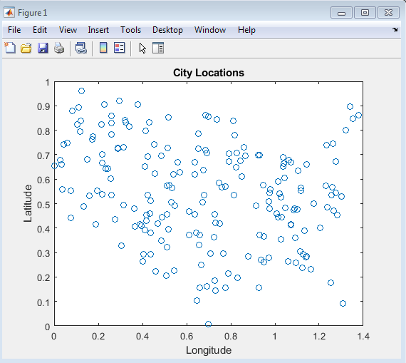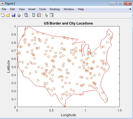 - Generate random city locations: Generate a set of random city locations within the US border. The number of cities is specified by the nStops variable.