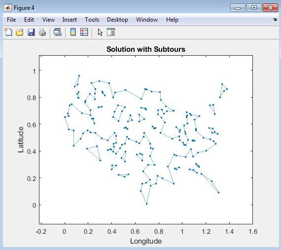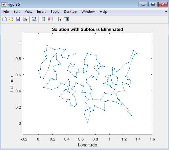 - Solve the TSP: Solve the TSP using the intlinprog function, which returns the optimal solution.