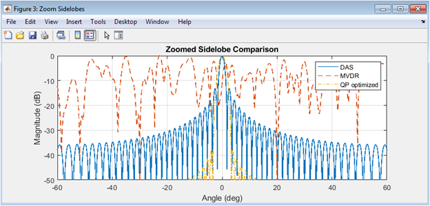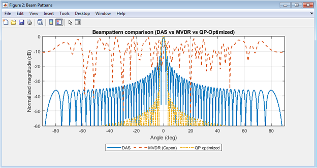 - Figure 3: Beam patterns of DAS, MVDR, and QP-based Beamforming techniques.