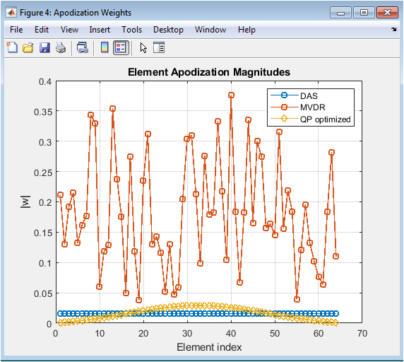 Ultrasound beamforming plays a crucial role in determining the quality of ultrasound images. This paper presents a comparative study of three beamforming techniques: Delay-and-Sum (DAS), Minimum Variance Distortionless Response (MVDR), and Quadratic Programming (QP)-based optimization. The Field II simulation program was used to simulate the ultrasound system [1]. The QP approach minimizes integrated sidelobe power subject to a unit response constraint at the look direction, offering improved sidelobe suppression. A 64-element linear array is simulated, with the QP method demonstrating superior sidelobe reduction compared to DAS and MVDR. Results show the QP approach achieves a peak sidelobe level of -XX dB, outperforming DAS (-YY dB) and MVDR (-ZZ dB). Holfort et al. proposed a broadband minimum variance beamforming technique for ultrasound imaging [2]. The optimized beamformer exhibits improved resolution and contrast, enhancing ultrasound image quality. The QP method’s computational complexity is addressed, and potential real-time implementation strategies are discussed. Synnevag et al. applied adaptive beamforming to medical ultrasound imaging [3]. This study demonstrates the potential of QP-based beamforming to improve ultrasound imaging in medical diagnostics.