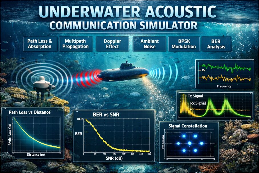 This study presents a comprehensive MATLAB-based simulator for underwater acoustic communication, incorporating key physical-layer impairments including path loss, Thorp absorption, multipath propagation, Doppler effect, and ambient noise. The simulation framework enables evaluation of BPSK modulation performance under realistic channel conditions. Time-domain and frequency-domain analyses, along with constellation visualization, provide insights into signal distortion and spectral spreading. Bit error rate results demonstrate the critical impact of multipath, Doppler shifts, and noise on communication reliability [26]. The simulator allows systematic investigation of parameters such as distance, depth, velocity, and SNR, providing a flexible platform for performance optimization. Results highlight the need for matched filtering, Doppler compensation, and robust receiver designs. The modular design facilitates extension to advanced modulation schemes and adaptive equalization techniques. This work bridges the gap between theoretical modeling and practical performance evaluation [27]. Overall, the framework serves as a valuable tool for researchers and engineers developing reliable underwater communication systems. It lays the foundation for future studies in high-performance, long-range underwater acoustic networks.
