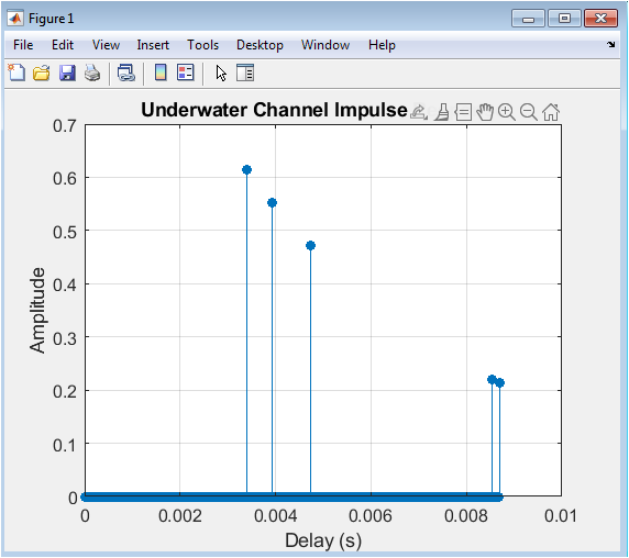 Figure 2 illustrates the channel impulse response of the simulated underwater acoustic channel. Each stem represents a multipath component corresponding to reflections from the sea surface, seabed, or obstacles. The height of each stem indicates the relative gain of that path, while the horizontal axis represents the time delay. The first peak corresponds to the direct path between transmitter and receiver, while subsequent peaks indicate delayed echoes. The multipath effect introduces inter-symbol interference, which can degrade communication reliability if not properly mitigated. This visualization helps in understanding how energy spreads over time in the channel. Longer delays and stronger reflected paths indicate a more severe channel environment. The figure provides insight for designing matched filters and equalizers at the receiver. By quantifying delay and amplitude of each path, researchers can evaluate system performance under realistic multipath conditions. Overall, this plot highlights the significance of channel modeling for underwater acoustic communication systems.