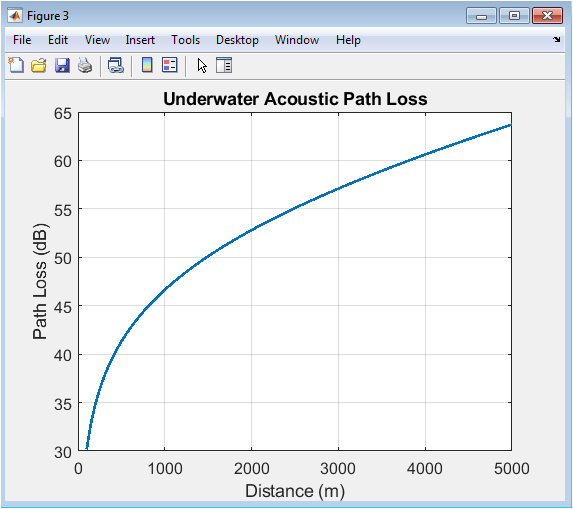 Figure 4 depicts the variation of path loss with increasing distance between transmitter and receiver. The plot combines the effects of geometric spreading and Thorp absorption loss. Path loss increases non-linearly as distance increases, indicating higher signal attenuation at longer ranges. This visualization helps in understanding how transmission power requirements scale with distance. The curve demonstrates that higher carrier frequencies experience more absorption, resulting in steeper losses. It provides a guideline for selecting suitable frequencies and transmission power for reliable communication. The plot also shows that even moderate distances can lead to significant signal degradation. By analyzing this curve, system designers can optimize link budgets and receiver sensitivity. It reinforces the importance of realistic channel modeling for performance prediction. Overall, this figure quantifies one of the most critical impairments in underwater acoustic communication.