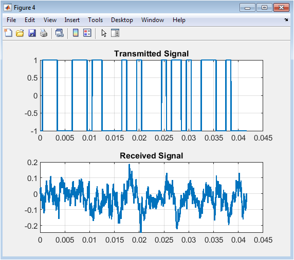Figure 5 compares the transmitted and received signals in the time domain. The top subplot shows the clean transmitted BPSK signal, while the bottom subplot shows the received signal after channel impairments and noise. Differences in amplitude and shape between the two signals illustrate the combined effects of multipath, Doppler shift, and ambient noise. Delayed peaks in the received signal reflect multipath components. Random fluctuations represent noise contributions, reducing signal clarity. This visualization allows direct assessment of how the channel distorts the transmitted waveform. It is useful for designing matched filters, equalizers, and synchronization algorithms. Observing the waveform also helps in detecting inter-symbol interference visually. The figure highlights the importance of signal processing techniques to recover transmitted data accurately. It serves as an intuitive demonstration of the physical-layer challenges in underwater communication systems.