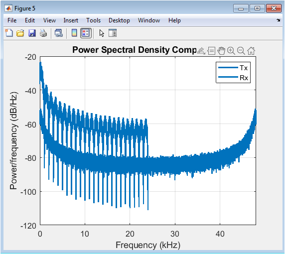 Figure 6 shows the power spectral density of the transmitted and received signals. The transmitted signal exhibits a narrowband spectrum centered at the carrier frequency. The received signal shows spectral broadening due to multipath propagation and Doppler effects. Noise contributions also elevate the spectral floor, reducing signal-to-noise ratio. Comparing both spectra helps quantify signal distortion and bandwidth spreading. This analysis guides filter design and frequency-domain equalization strategies. Peaks in the received spectrum correspond to multipath components and Doppler-shifted signals. The figure provides insight into how physical-layer impairments affect frequency content. It is essential for evaluating spectral efficiency and detecting interference. Overall, this plot illustrates how channel characteristics impact the signal in the frequency domain and aids performance analysis.