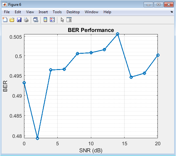 Figure 7 presents the bit error rate performance of the BPSK system under varying SNR conditions. The plot demonstrates the expected exponential decay of BER with increasing SNR. At low SNR, noise and channel impairments result in higher error rates. As SNR increases, the receiver is able to recover transmitted bits more reliably. The curve quantifies the impact of multipath, Doppler, and ambient noise on communication reliability. This plot is a key performance metric for evaluating modulation schemes and receiver designs. It helps determine the required SNR for a desired error performance. The figure also serves as a benchmark for comparing alternative modulation or coding schemes. It provides insight into system limitations under realistic channel conditions. Overall, it highlights the trade-off between transmission power, noise, and reliability in underwater communication.