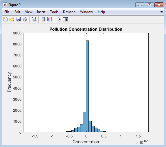 This histogram figure 10 displays the frequency distribution of pollutant concentrations across the city. It shows the number of grid points falling within specific concentration ranges. Peaks indicate the most common concentration levels, while tails represent extreme pollution hotspots. The histogram allows quantitative analysis of pollution variability. It highlights how emission control and green-belt absorption shift the distribution towards lower values. Researchers can evaluate statistical measures such as mean, median, and variance from this figure. It complements spatial surface plots by providing a city-wide summary. The visualization is useful for environmental risk assessment and policy evaluation. It also supports calibration of model parameters for realistic simulation. Overall, this figure provides a statistical perspective on urban air quality.