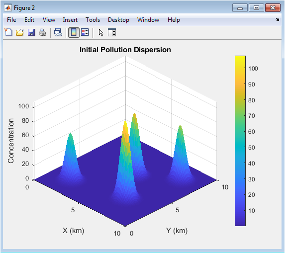 This surface plot figure 3 shows the initial distribution of pollutants across the city immediately after emissions. Each emission source contributes to the total concentration, forming overlapping Gaussian plumes. Peaks in the surface represent regions of high pollution near sources, while valleys indicate lower concentrations in surrounding areas. The lateral and vertical dispersion coefficients control the spread of the plumes. This figure highlights the combined effect of multiple sources on urban air quality. It helps identify the most critical areas requiring control interventions. The visualization demonstrates the effectiveness of Gaussian plume modeling in capturing realistic pollutant spread. Researchers can use this figure to compare how emission reduction or environmental mitigation strategies will alter the dispersion. The 3D perspective allows observation of both horizontal and vertical pollutant gradients. It provides a baseline for subsequent diffusion and control simulations.