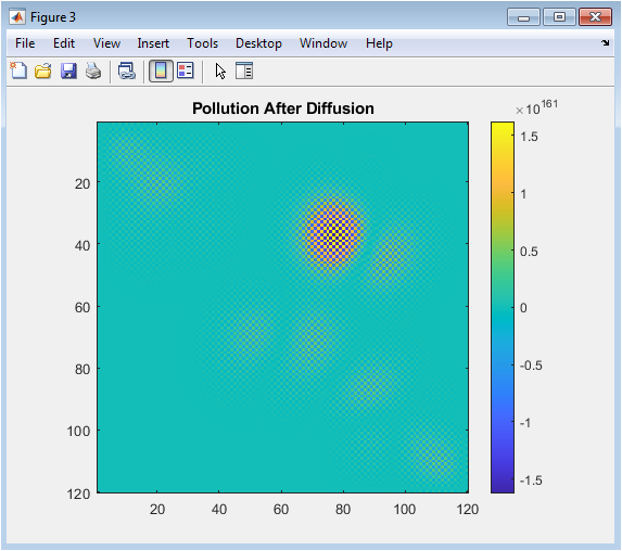 This figure 4 represents the pollutant concentrations after simulating diffusion over time. The diffusion model spreads the pollutants further across the city, representing atmospheric mixing processes. Peaks near the sources become less pronounced as pollutants disperse into surrounding areas. This visualization shows the natural tendency of pollutants to spread and dilute over time. It highlights areas where pollution persists despite diffusion, indicating potential health risks. Comparing this figure with the initial dispersion helps assess the impact of atmospheric turbulence. It also provides a visual basis for evaluating mitigation measures, such as green belts or emission reduction. The color scale allows easy identification of high and low concentration regions. This figure is essential for understanding the temporal evolution of pollutant distribution. It demonstrates how diffusion smooths extreme concentration values while maintaining overall exposure patterns.