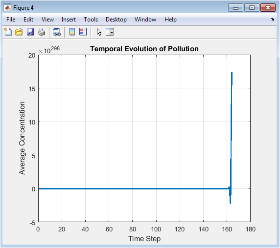 This line plot figure 5 shows how the average pollutant concentration changes over the simulation time steps. It quantifies the cumulative effect of diffusion and atmospheric transport on urban air quality. Peaks indicate periods of higher concentration due to persistent emissions or slower diffusion. A declining trend shows how dispersion and dilution reduce average pollutant levels over time. This visualization helps understand the dynamic behavior of pollutants in the city environment. It allows comparison of different scenarios, such as varying wind speeds or emission rates. Temporal evolution is critical for assessing the long-term effectiveness of control strategies. The plot can inform policymakers about potential times of high exposure. It also validates the numerical stability of the simulation framework. Overall, this figure links spatial simulations with temporal trends for a complete understanding of pollution dynamics.