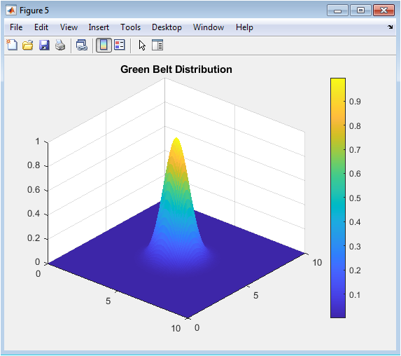 This figure 6 shows the spatial distribution of green belts implemented as pollutant absorption zones. High-density regions correspond to areas with significant vegetation that can remove pollutants from the air. The green belt model modifies pollutant concentration according to absorption coefficients, simulating environmental mitigation effects. The visualization helps identify which regions benefit most from vegetation placement. It also demonstrates how strategic urban planning can enhance air quality. The smooth distribution reflects the exponential decay used in the model, representing realistic green-belt influence. This figure is essential for evaluating the effectiveness of vegetation in pollution reduction. Researchers can test alternative green-belt layouts to optimize absorption. The figure highlights the importance of environmental interventions alongside emission control. It provides a visual representation of sustainable urban planning strategies.
