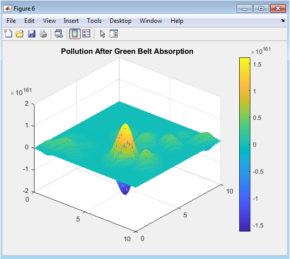 This surface plot figure 7 shows how pollutant levels are reduced in areas with green-belt coverage. Peaks near emission sources are lower compared to uncontrolled dispersion, reflecting the absorption effect. The visualization demonstrates the combined influence of natural diffusion and green-belt mitigation. It identifies regions where pollution remains high despite environmental interventions. This figure provides insights into the optimal placement of vegetation to maximize air quality improvement. Comparing this figure with previous plots highlights the effectiveness of green-belt strategies. The 3D perspective allows detailed observation of spatial gradients in controlled pollution. It also serves as a validation tool for absorption coefficients used in the model. Researchers can use this figure to quantify expected reductions in pollutant concentrations. Overall, it reinforces the role of green infrastructure in sustainable urban air management.