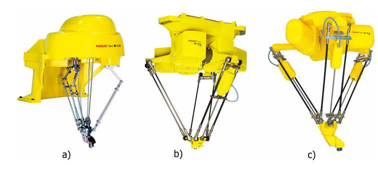 Figure 2: Three different sizes of FANUC delta robots – from smallest (left) to biggest one (right): a) M1-iA, b) M2-iA, c) M3-iA [7]