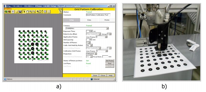 Figure 4: Screen of Camera Calibration Tool (a) and calibration grid for alignment of camera and robot coordinate system during configuration of iRVision system (b)