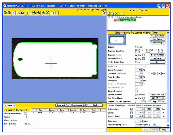 Figure 6: Main window of Vision Process Tool “MES1_A1” for identification of the first part