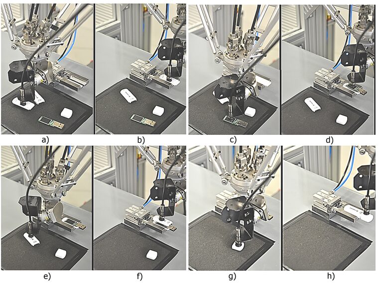 Figure 7: . Assembly process of USB memory stick: base part picking (a) and in assembly position (b); electronic board picking (c) and in assembly position (d); upper part picking (e) and in assembly position (f); cup picking (g) and in assembly position (h)