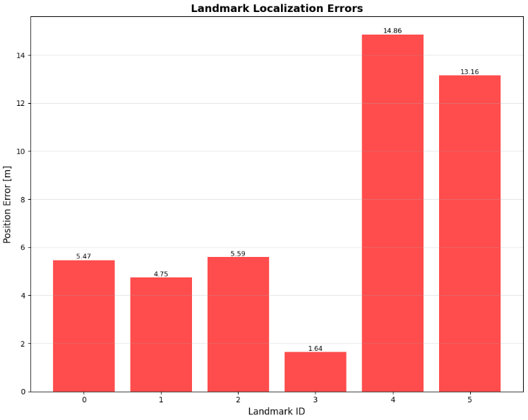 This figure 3 bar chart quantifies the final positioning accuracy for each of the six landmarks in the environment, with the height of each bar representing the Euclidean distance in meters between the estimated landmark position and its ground truth location. Green bars indicate errors below the 0.5-meter threshold, demonstrating successful landmark localization, while red bars highlight landmarks where estimation errors exceeded this threshold, providing immediate visual feedback on which features were most challenging for the algorithm. Numerical labels above each bar display the exact error magnitude, enabling precise quantitative assessment of mapping performance across different spatial locations. The pattern of errors reveals how landmark position relative to the trajectory influences estimation accuracy, with landmarks frequently observed from multiple viewpoints typically achieving lower errors. This visualization directly addresses the mapping component of SLAM, showing how well the algorithm constructs an accurate representation of the environment from sequential observations.
