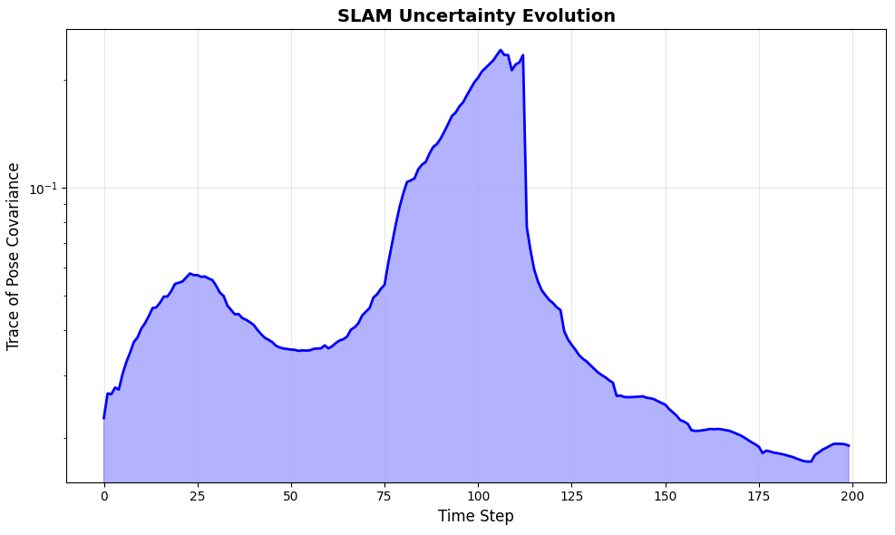 This figure 4 illustrates how the overall uncertainty in robot pose estimation evolves throughout the simulation by plotting the trace of the pose covariance matrix against time on a logarithmic scale. The characteristic sawtooth pattern reveals the fundamental behavior of SLAM systems, where uncertainty increases during motion when the robot relies solely on its noisy motion model, then sharply decreases when observations of landmarks provide information that corrects accumulated drift. The blue fill area beneath the curve emphasizes the magnitude of uncertainty at each time step, making it easy to identify periods of high uncertainty that correspond to long motion segments without landmark observations. The logarithmic vertical scale is essential for capturing the wide dynamic range of uncertainty values, which can span several orders of magnitude between motion phases and correction phases. This plot provides crucial insight into the filter’s convergence properties and helps validate that the uncertainty representation correctly reflects the information gained from sensor measurements.