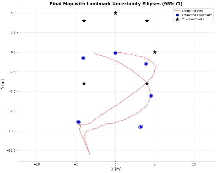 This figure 6 comprehensive visualization displays the final state of the SLAM system by showing the estimated robot path in red, estimated landmark positions as blue circles, true landmark positions as black stars, and most importantly, the uncertainty ellipses around each estimated landmark representing ninety-five percent confidence intervals. The orientation and size of each ellipse reveal the directional uncertainty in landmark localization, with elongated ellipses indicating that the landmark position is more certain in one direction than another, typically reflecting the geometry of observations. Landmarks observed from multiple angles typically exhibit more circular ellipses with smaller areas, indicating well-constrained positions, while landmarks observed only from limited viewpoints show elongated ellipses with larger uncertainty along certain directions. The overlay of true landmark positions within the ellipses demonstrates the estimator’s consistency, as ground truth should fall within the confidence region for well-calibrated filters. This figure provides the most complete picture of mapping performance, simultaneously showing estimated positions, their associated uncertainties, and the true values against which they can be compared.